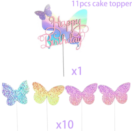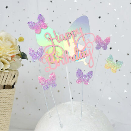 1 pcs Gradient Butterfly Pink Happy Birthday Cake Topper along with 5 pcs butterflies topper set